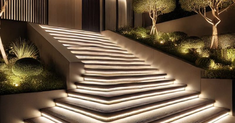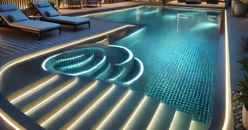 L’installation de bandes LED dans les marches de piscine ou autour des margelles offre une lumière douce et sécurisante, mettant en valeur votre espace extérieur.