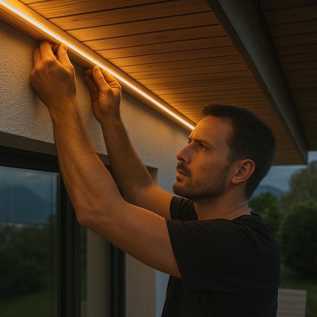 Après réception des dimensions du client, notre équipe a pris en charge la commande en réalisant des découpes précises des rubans LED, en veillant à respecter scrupuleusement chaque section du pourtour de toiture. L’objectif : garantir une intégration parfaite des profilés et des rubans dans les sous-faces bois du toit, sans ajustement ultérieur, pour un rendu net, discret et parfaitement aligné avec l’architecture de la maison.