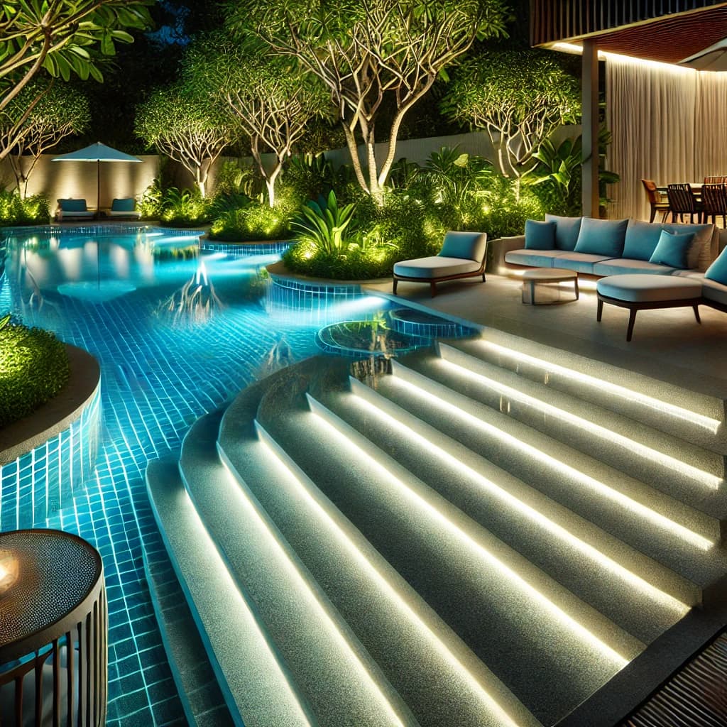 Nous nous engageons à vous offrir un service de qualité supérieure, alliant innovation, durabilité et design. Transformez vos marches de piscine et margelles en un espace fonctionnel et esthétique grâce à nos solutions d’éclairage LED sur mesure. Contactez-nous dès aujourd’hui pour discuter de votre projet et découvrir comment nous pouvons illuminer votre piscine avec style et efficacité.