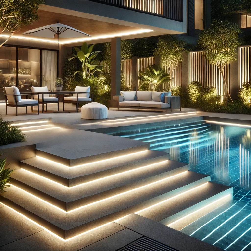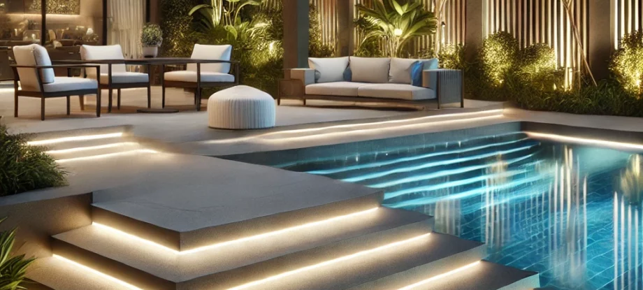 Installés discrètement le long des bords, les rubans LED accentuent les contours de la piscine et ajoutent une lumière douce qui met en valeur les margelles, tout en assurant une visibilité optimale la nuit. Ce type d’éclairage non seulement embellit votre espace extérieur, mais il renforce également la sécurité, en facilitant l’accès à la piscine même après le coucher du soleil.